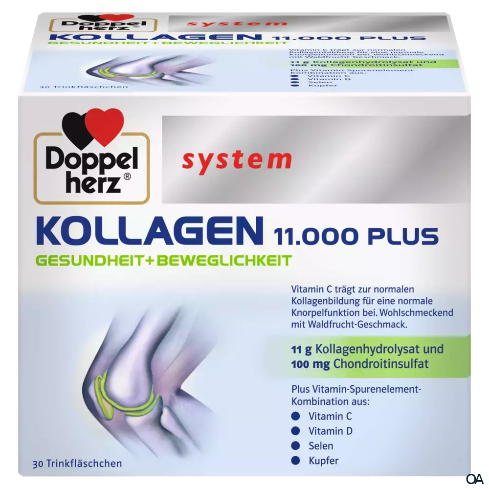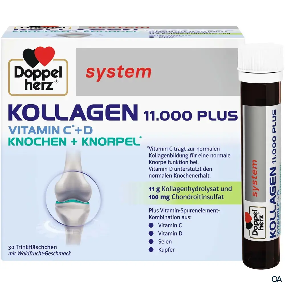 Doppelherz system KOLLAGEN 11.000 PLUS Trinkfläschchen - Vitamin C trägt zur normalen Kollagenbildung für eine normale Knorpelfunktion bei. Wohlschmeckend mit Waldfrucht-Geschmack. 11 g Kollagenhydrolysat und 100 mg Chondroitinsulfat.