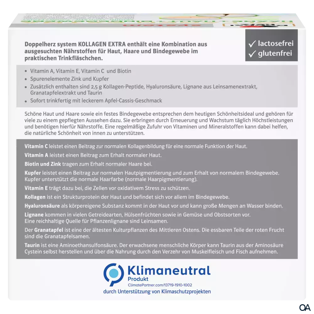 Doppelherz system KOLLAGEN EXTRA enthält eine Kombination aus ausgesuchten Nährstoffen für Haut, Haare und Bindegewebe im praktischen Trinkfläschchen. Die Trinkfläschchen sind sofort trinkfertig mit leckerem Apfel-Cassis-Geschmack.