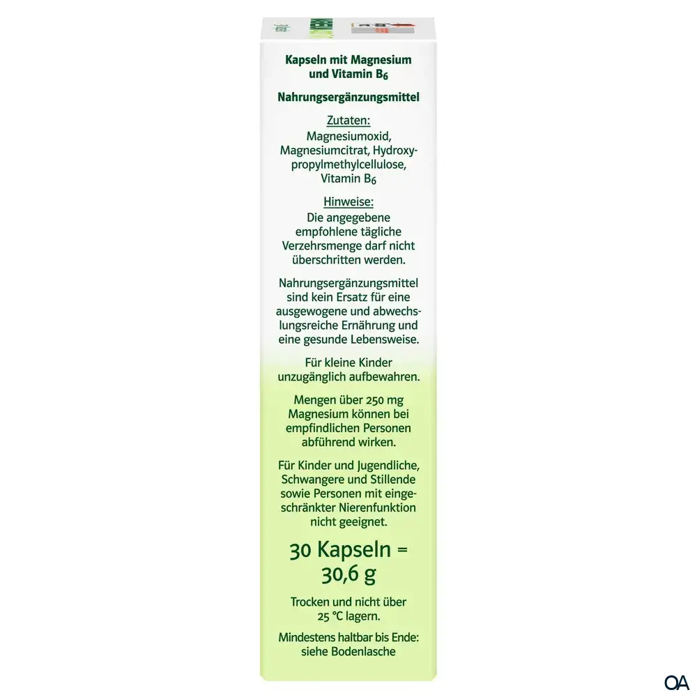 - Zutaten: Magnesiumoxid, Magnesiumcitrat, Hydroxypropylmethylcellulose, Vitamin B6.