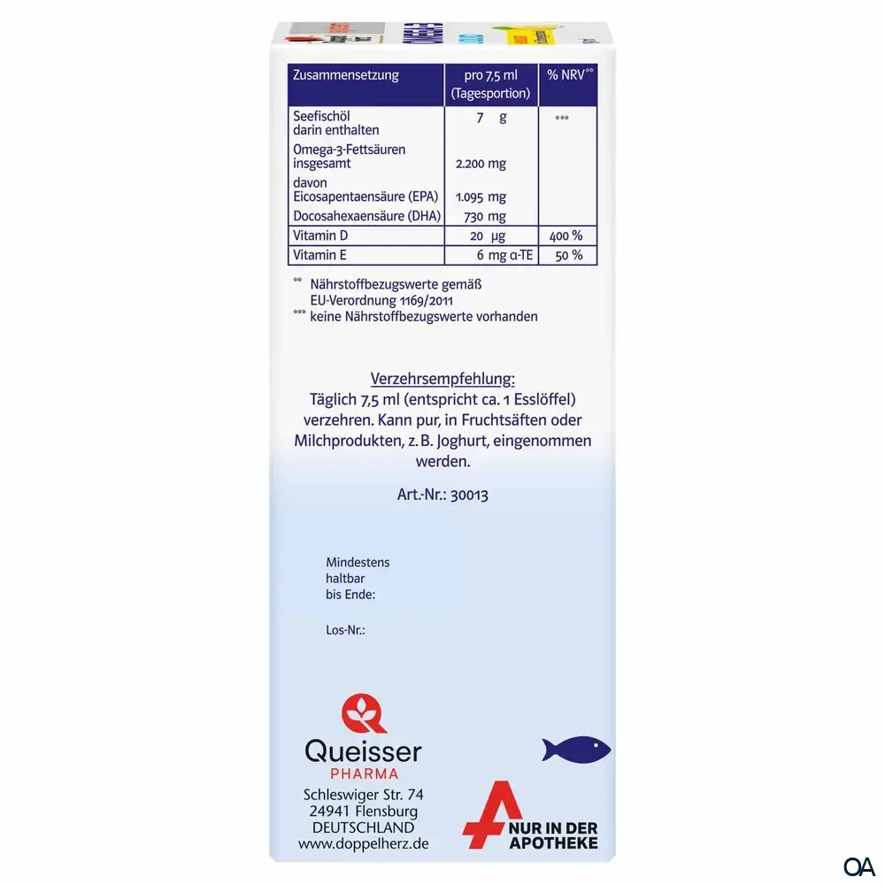 - Zusammensetzung pro Tagesdosis (7,5 ml): Omega-3-Fettsäuren insgesamt 2.200 mg.