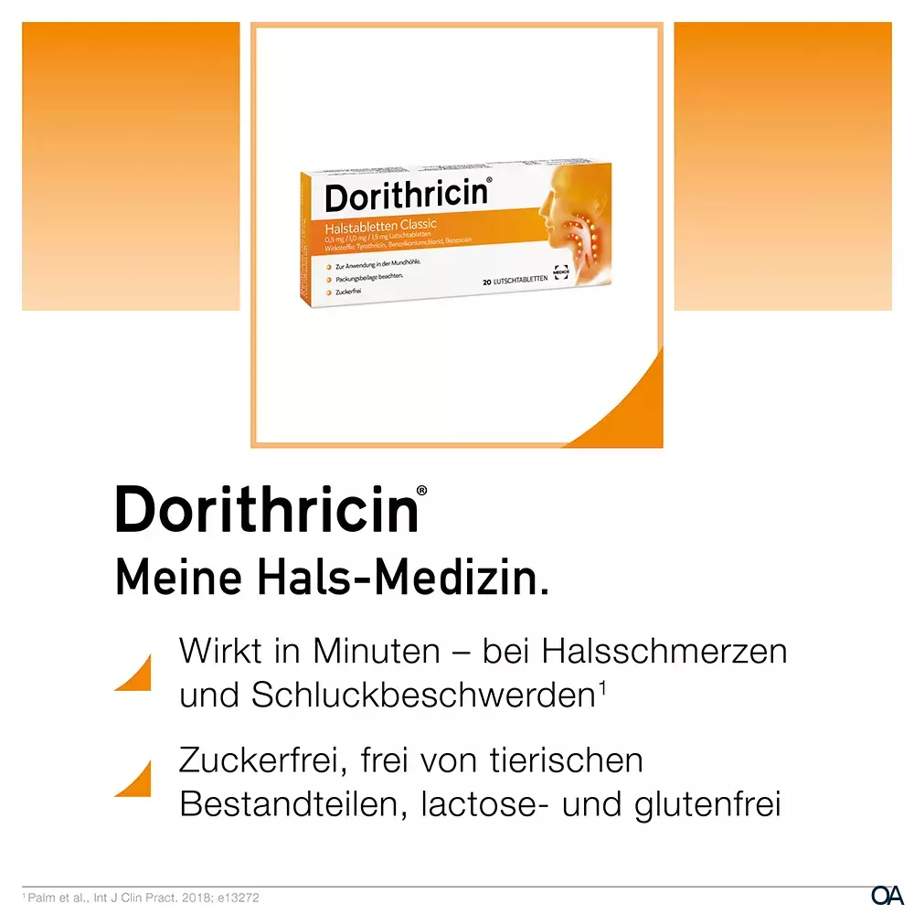 Zur Behandlung von Halsschmerzen und Schluckbeschwerden hat sich Dorithricin® seit Jahrzehnten ausgezeichnet bewährt. Es hilft schnell und effektiv zugleich. Mit der einzigartigen Wirkstoff-Formel lindert Dorithricin® nicht nur schnell den Schmerz, sondern bekämpft auch gezielt Viren und Bakterien und bremst den Infekt, bevor die Halsschmerzen schlimmer werden.