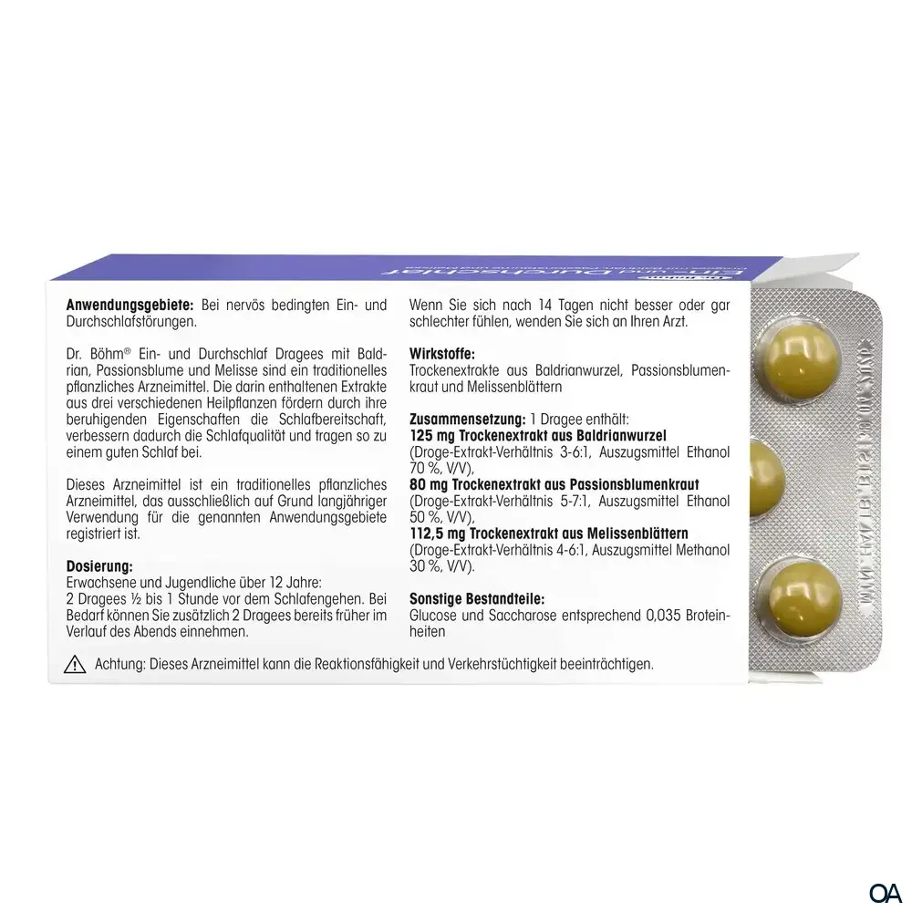 - Dr. Böhm® Ein- und Durchschlaf unterstützt Ihren gesunden, erholsamen Schlaf mit reiner Pflanzenkraft. Die hochwirksame, natürliche 3-fach-Kombination aus Baldrian, Passionsblume und Melisse sorgt sanft und schonend dafür, dass Sie besser einschlafen, gut durchschlafen und erholt aufwachen.