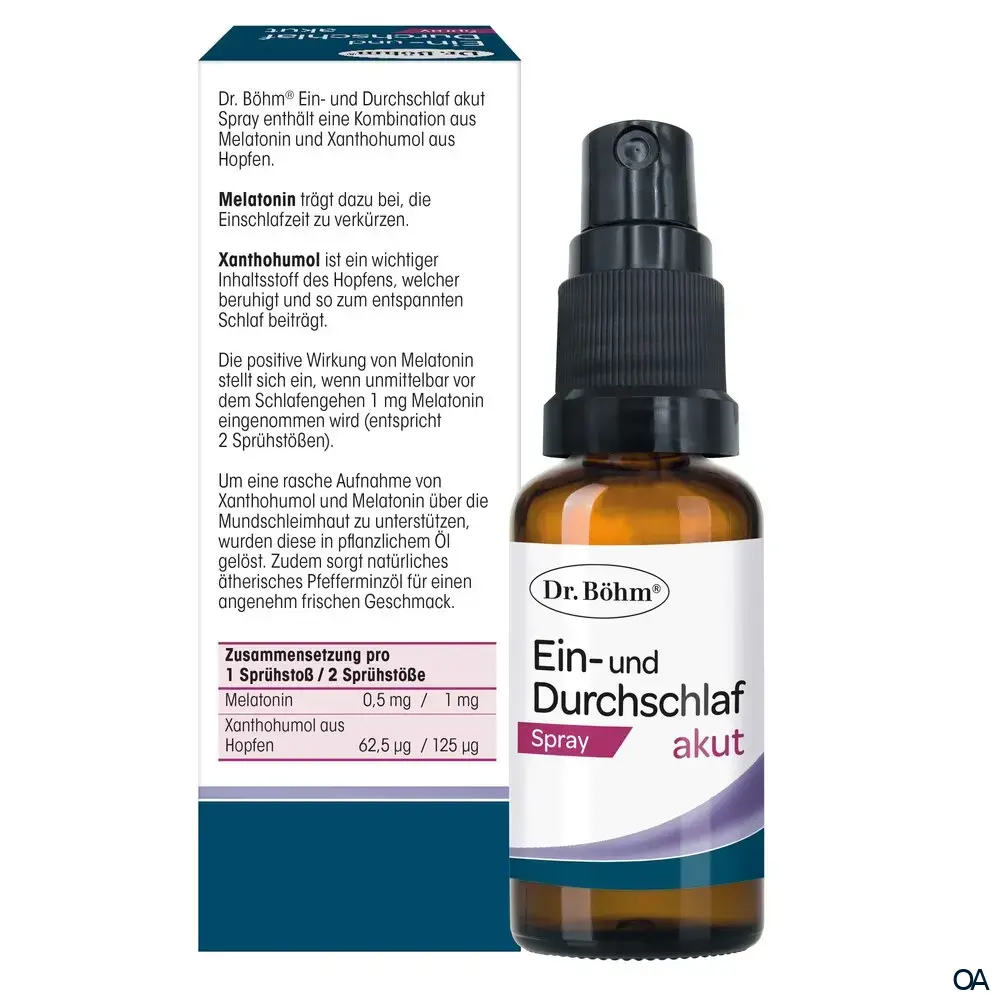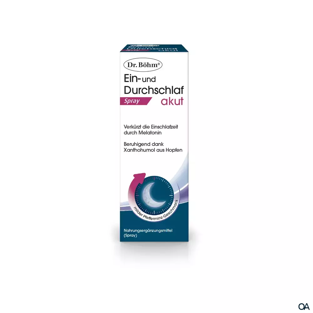 Dr. Böhm® Ein- und Durchschlaf akut Spray ist ein Nahrungsergänzungsmittel zur Verkürzung der Einschlafzeit durch Melatonin. Das enthaltene Xanthohumol aus Hopfen wirkt beruhigend.