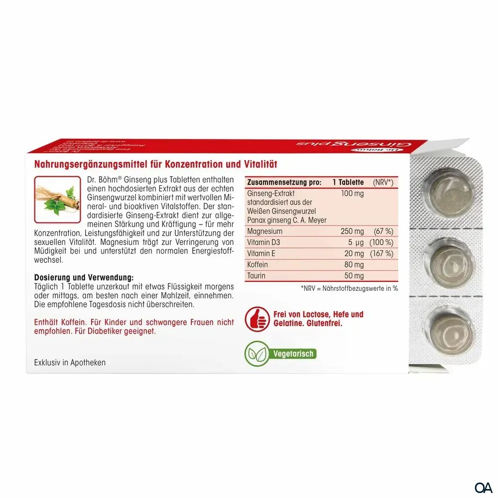 Dr. Böhm® Ginseng plus Tabletten sind ein Nahrungsergänzungsmittel zur Unterstützung für eine gesteigerte Konzentration und Vitalität! Plus Magnesium zur Verringerung von Müdigkeit.Dr. Böhm® Ginseng plus Tabletten sind ein Nahrungsergänzungsmittel zur Unterstützung für eine gesteigerte Konzentration und Vitalität! Plus Magnesium zur Verringerung von Müdigkeit.
