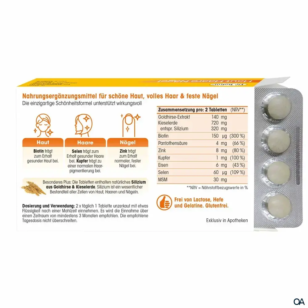 Kieselerde 360 mg, Kupfer 0,5 mg, Goldhirse-Extrakt 70 mg, Eisen 3,0 mg, Biotin 75 μg, Selen 30 μg, Pantothensäure 2,0 mg, MSM 15 mg, Zink 4,0 mg,