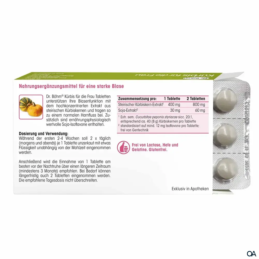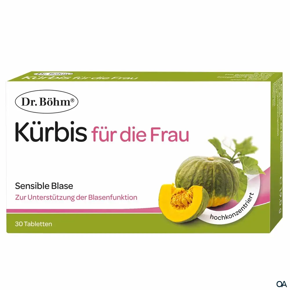 Dr. Böhm® Kürbis für die Frau Tabletten zur Unterstützung für eine sensible Blase und der Blasenfunktion. Hochkonzentrierter Kürbis-Extrakt zur Unterstützung der Blasenfunktion. Soja-Isoflavone unterstützen die weibliche Balance.Dr. Böhm® Kürbis für die Frau Tabletten zur Unterstützung für eine sensible Blase und der Blasenfunktion. Hochkonzentrierter Kürbis-Extrakt zur Unterstützung der Blasenfunktion. Soja-Isoflavone unterstützen die weibliche Balance.