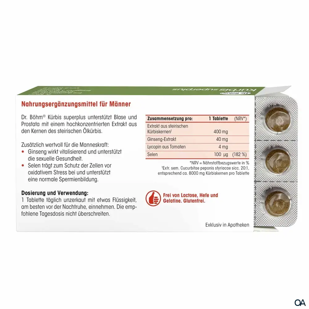 Dr. Böhm® Kürbis superplus Tabletten sind ein Nahrungsergänzungsmittel zur Unterstützung der Blase und Prostata. Mit Ginseng für die Manneskraft und Selen für die Spermienbildung.Dr. Böhm® Kürbis superplus Tabletten sind ein Nahrungsergänzungsmittel zur Unterstützung der Blase und Prostata. Mit Ginseng für die Manneskraft und Selen für die Spermienbildung.