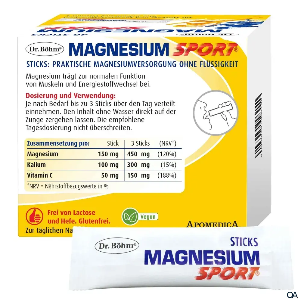 Die Dr. Böhm® Magnesium Sport® Sticks sind ein Nahrungsergänzungsmittel zur Unterstützung für Ausdauer und Leistung – Magnesium und Kalium für unterwegs! Für Muskeln und Energiestoffwechseln, reduziert Müdigkeit und Erschöpfung.Die Dr. Böhm® Magnesium Sport® Sticks sind ein Nahrungsergänzungsmittel zur Unterstützung für Ausdauer und Leistung – Magnesium und Kalium für unterwegs! Für Muskeln und Energiestoffwechseln, reduziert Müdigkeit und Erschöpfung.