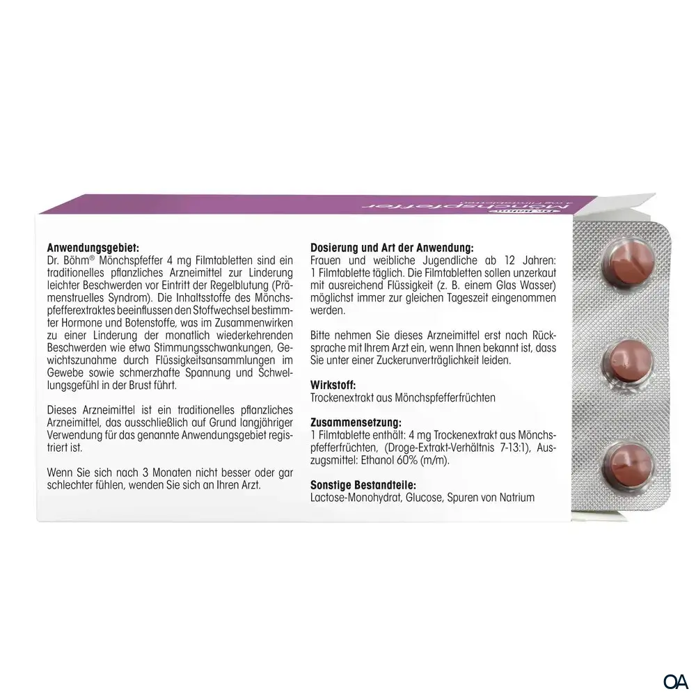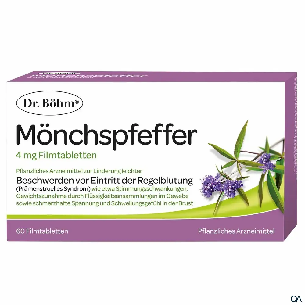 Die Dr. Böhm® Mönchspfeffer 4 mg - Filmtabletten sind ein traditionelles pflanzliches Arzneimittel zur Linderung leichter Beschwerden vor Eintritt der Regelblutung (Prämenstruelles Syndrom).Die Dr. Böhm® Mönchspfeffer 4 mg - Filmtabletten sind ein traditionelles pflanzliches Arzneimittel zur Linderung leichter Beschwerden vor Eintritt der Regelblutung (Prämenstruelles Syndrom).