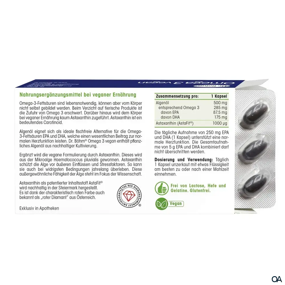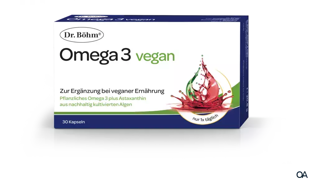 Dr. Böhm® Omega 3 vegan Kapseln sind ein Nahrungsergänzungsmittel zur Ergänzung bei einer veganen Ernährungsweise. Enthält pflanzliches Omega 3 plus Astaxanthin aus nachhaltig kultivierten Algen.