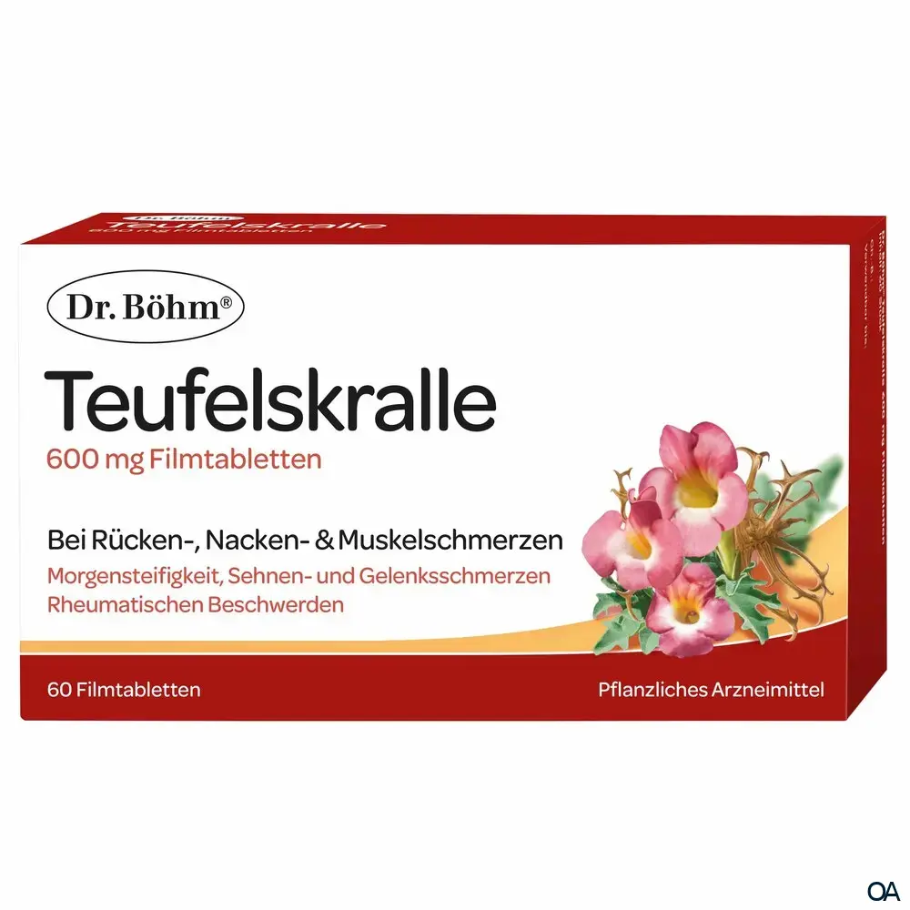 Die Dr. Böhm® Teufelskralle 600 mg Filmtabletten sind ein pflanzliches Arzneimittel zur unterstützendend Behandlung bei Rücken,-Nacken,- und Muskelschmerzen, Morgensteifigkeit sowie leichten Sehnen-und Gelenksschmerzen.Die Dr. Böhm® Teufelskralle 600 mg Filmtabletten sind ein pflanzliches Arzneimittel zur unterstützendend Behandlung bei Rücken,-Nacken,- und Muskelschmerzen, Morgensteifigkeit sowie leichten Sehnen-und Gelenksschmerzen.