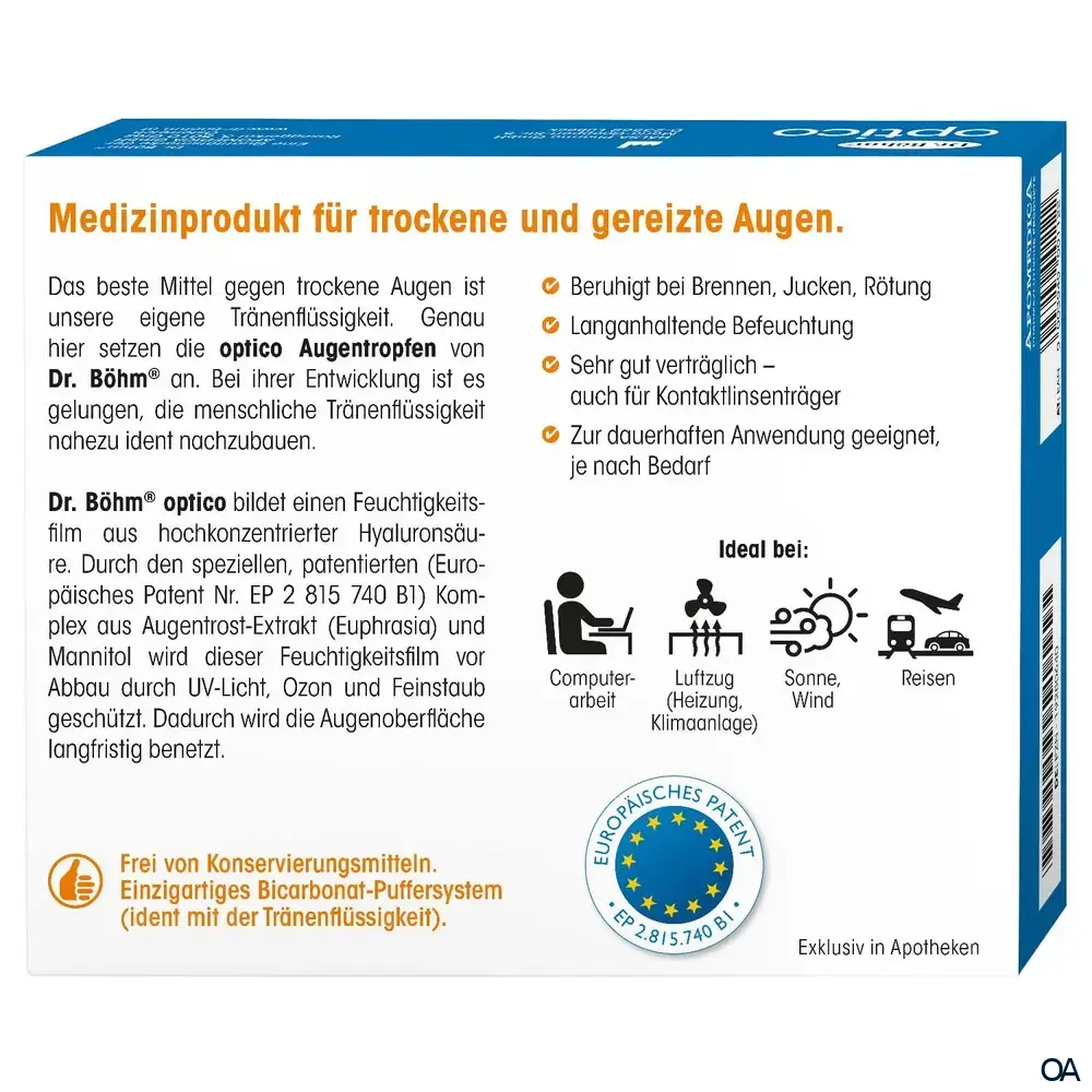 Dr. Böhm® optico Augentropfen für trockene und gereizte Augen, ideal für unterwegs! Langanhaltendende Befeuchtung dank hochkonzentriertem Hyaluronat und Augentrost.Dr. Böhm® optico Augentropfen für trockene und gereizte Augen, ideal für unterwegs! Langanhaltendende Befeuchtung dank hochkonzentriertem Hyaluronat und Augentrost.