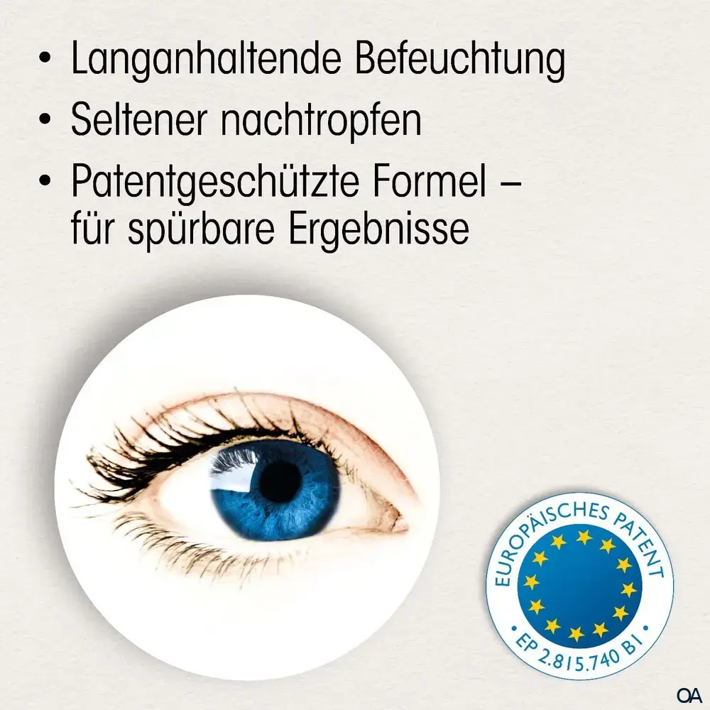 - Natriumhyaluronat 0,25%: Langkettige Hyaluronsäure kann besonders viel Feuchtigkeit binden und wirkt am Auge wie ein Feuchtigkeitsdepot, das kontinuierlich Wasser freisetzt. Sie bildet zusätzlich eine Schutzschicht und vermindert die Reibung auf der Augenoberfläche.