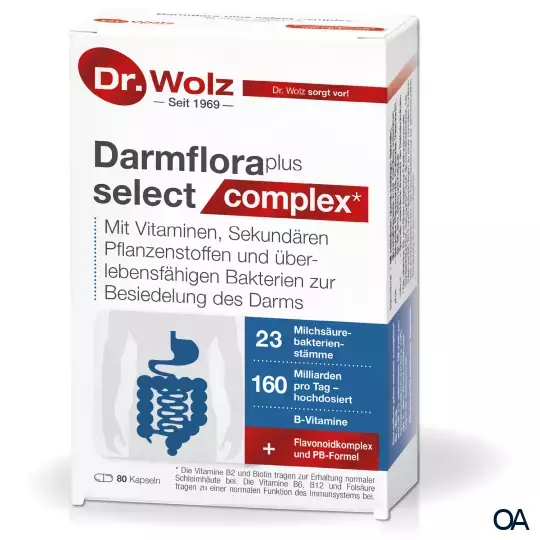 - Die individuelle Dosierbarkeit von Darmflora plus select complex* kommt besonders auch bei einer gleichzeitigen Antibiotika-Therapie zum Tragen. Dann sollte das Produkt mit einem möglichst großen Zeitabstand zum Antibiotikum eingenommen werden.