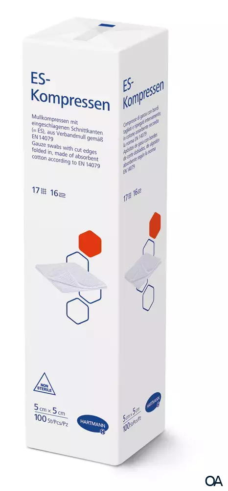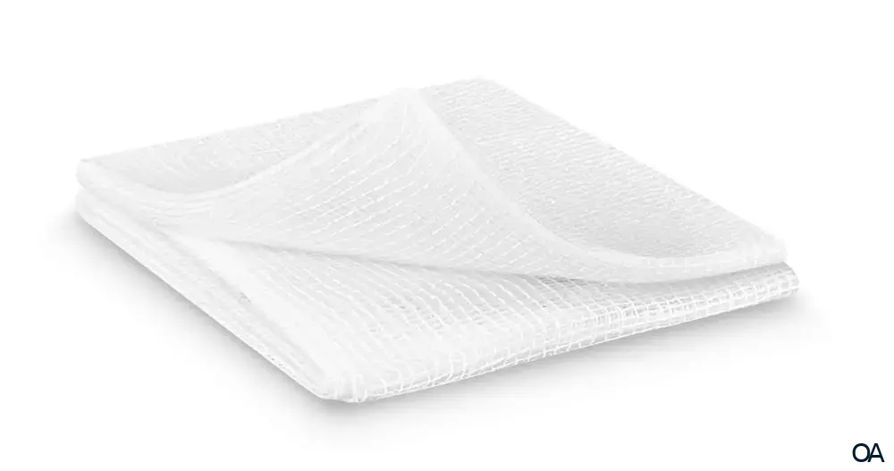 Aus Verbandmull EN 14079, 17-fädig, mit eingeschlagenen Schnittkanten (= ES), auch mehrfach aufgeklappt in größeren Formaten verwendbar, ohne dass störende Randfäden auftreten, gute Saugfähigkeit, luftdurchlässig, weich und geschmeidig.