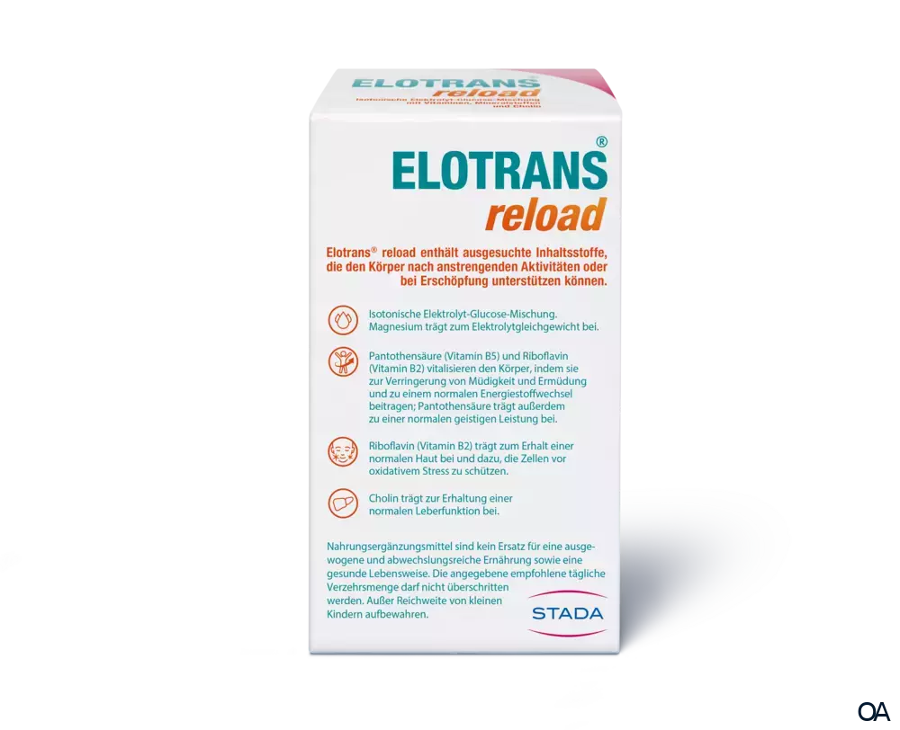 Das Elotrans® reload Trinkpulver ist ein Nahrungsergänzungsmittel zur Herstellung einer isotonischen Elektrolyt-Glucose-Trinkmischung mit Vitaminen, Mineralstoffen und Cholin. Mit Orangen-Geschmack, Zucker und Süßungsmittel.