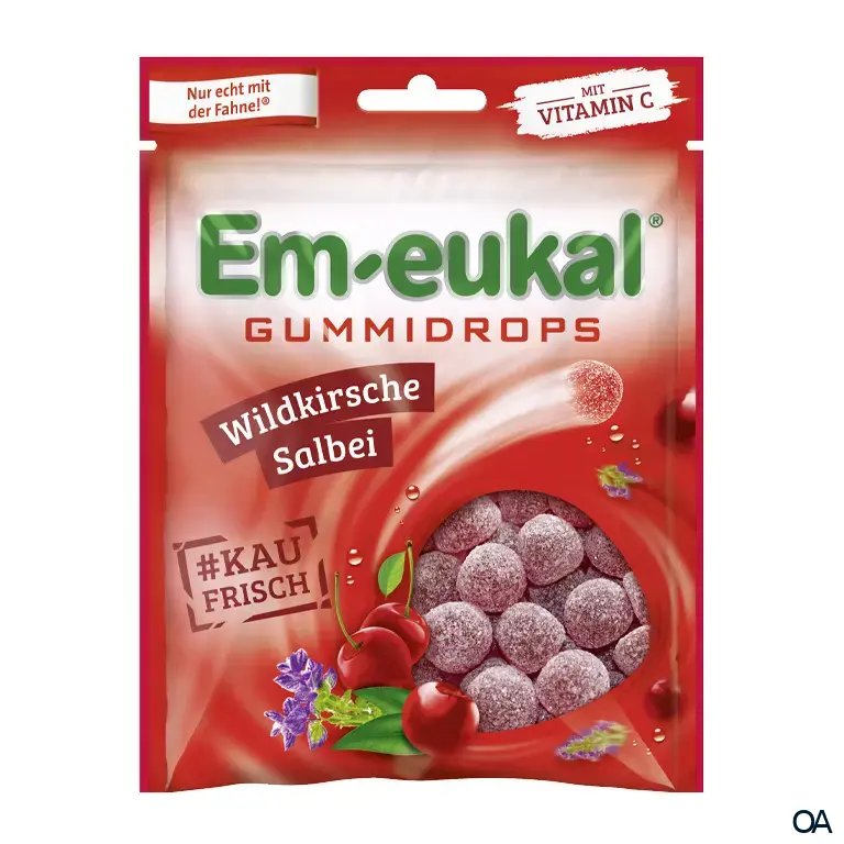 Entdecken Sie die Em-eukal Gummidrops Wildkirsche-Salbei. Die einzigartige Kombination aus fruchtiger Kirsche und würzigem Salbei, angereichert mit wertvollen Vitaminen, bietet ein wohltuendes Geschmackserlebnis für Hals und Rachen.