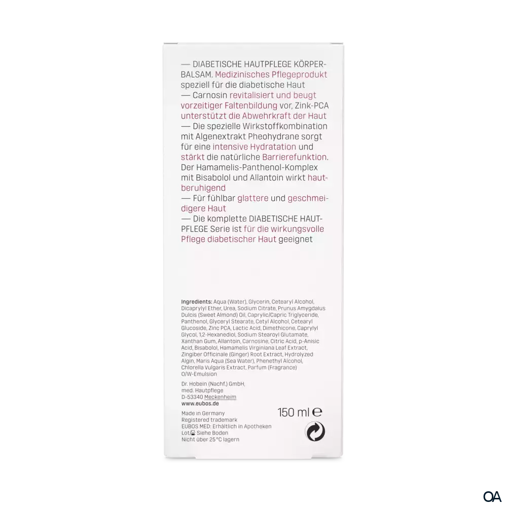 Eubos DIABETISCHE HAUT PFLEGE KÖRPERBALSAM - Bei trockener, strapazierter Haut von Diabetikern mit Neigung zu Erschlaffung.Der Körperbalsam (O/W-Emulsion) mit speziell auf die diabetische Haut abgestimmten Wirkstoffen spendet tiefenwirksam und langanhaltend Feuchtigkeit. Für die tägliche Körperpflege bei trockener, sehr trockener, spannender und gereizter Haut.