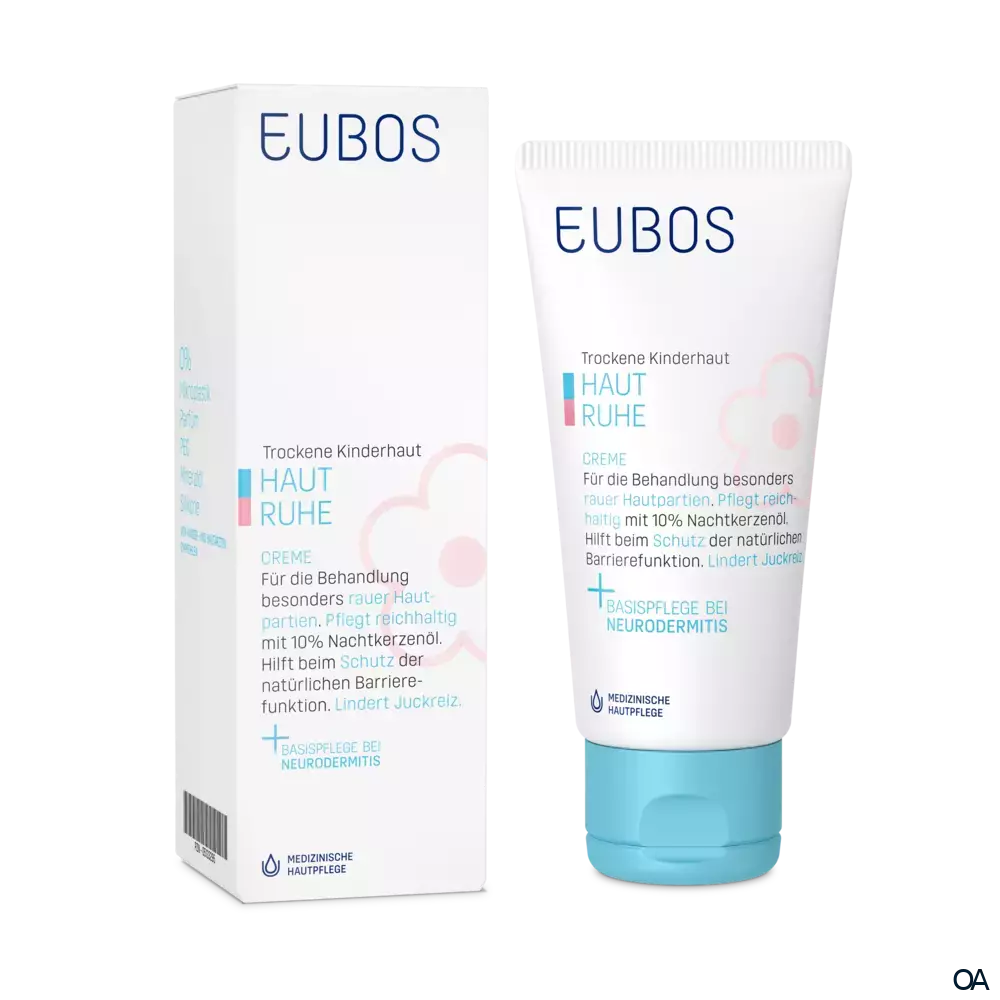 Eubos HAUT RUHE CREME - Die reichhaltige W/O-Emulsion mit Nachtkerzenöl, Vitamin-Komplex und Johanniskraut-Extrakt ist eine medizinische Intensivpflege-Creme für Kinder- und zarte Baby-Haut.