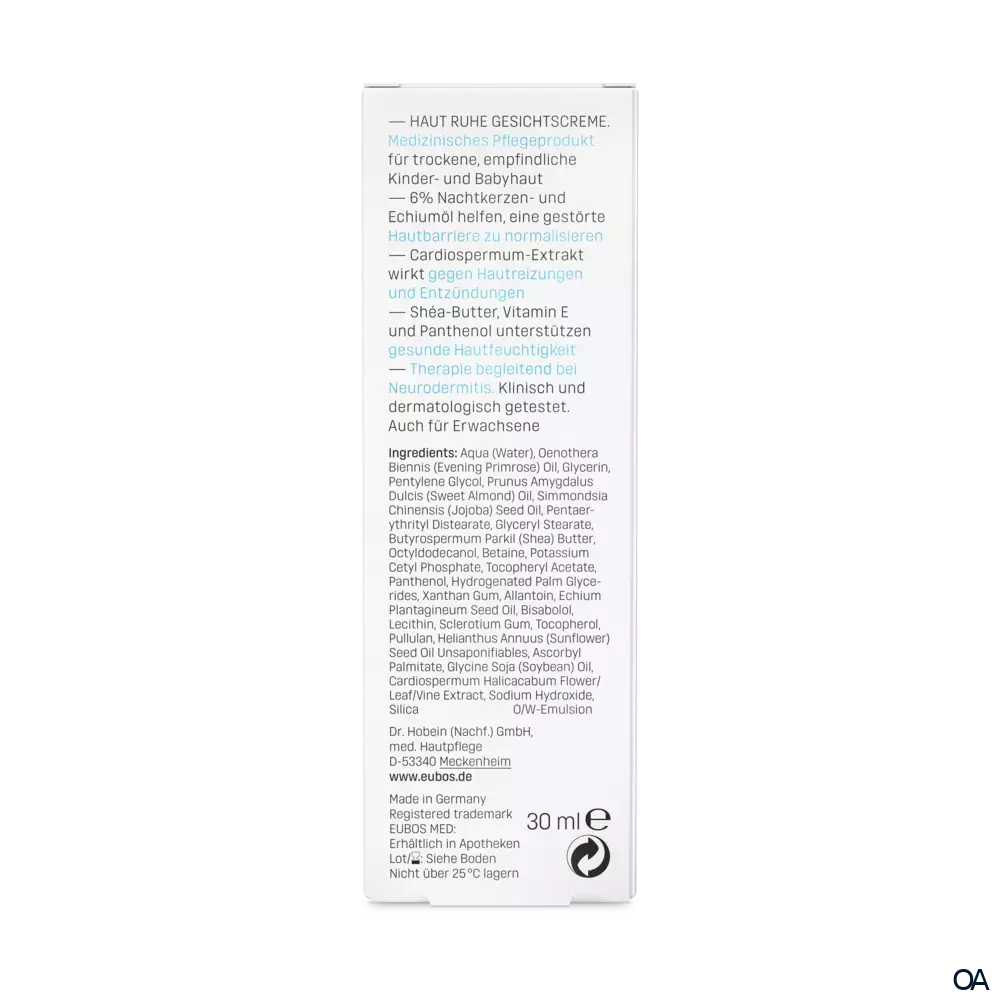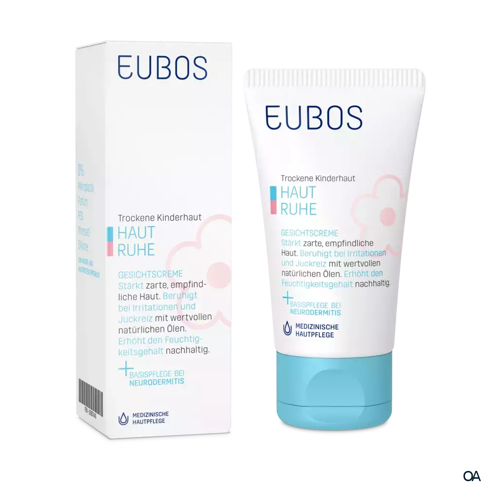 Eubos HAUT RUHE GESICHTSCREME - Die leicht verteilbare, gut einziehende O/W-Emulsion mit den Lipiden Omega-6 und -3 aus Nachtkerzen- und Echiumöl, mit Vitaminkomplex ist eine medizinische Gesichtspflege für die zarte Kinder- und Baby-Haut.