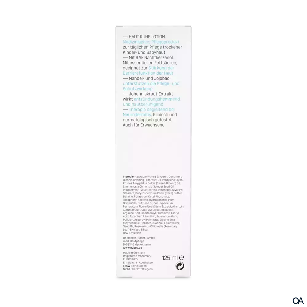 HAUT RUHE LOTION enthält 6 % wertvolles Nachtkerzenöl mit den essenziellen Fettsäuren Linolsäure und gamma-Linolensäure, die sehr wesentlich für den Aufbau der natürlichen Barrierefunktion der Haut sind und bei Neurodermitis häufig aufgrund eines Enzymdefektes fehlen.