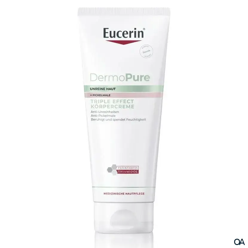 Eucerin DermoPure Triple Effect ist eine klinisch getestete Körpercreme mit Salicylsäure und patentiertem Thiamidol reduziert effektiv hartnäckige Hautunreinheiten & Pickelmalen am Körper (z.B. Brust, Rücken, Schultern), beruhigt und spendet Feuchtigkeit.
