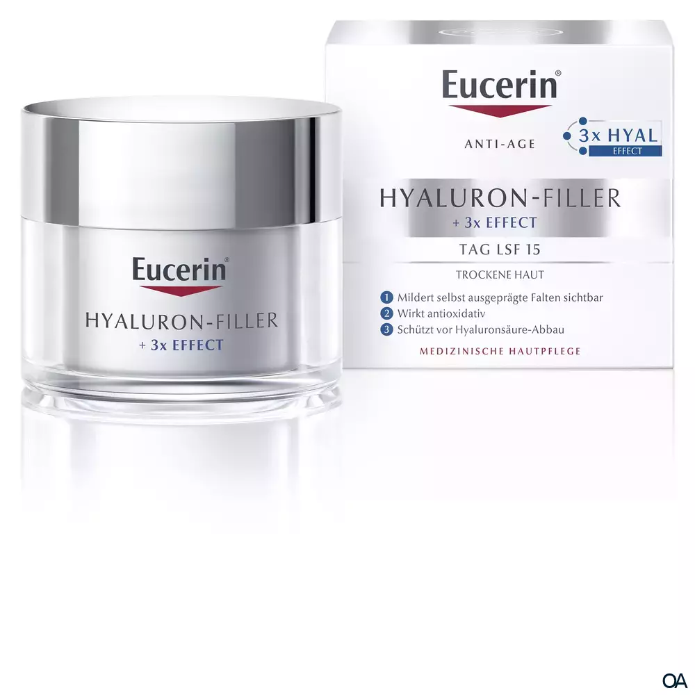 Eucerin® HYALURON-FILLER + 3x EFFECT LSF 15 Tagespflege für trockene Haut ist eine Anti-Age Tagescreme mit Hyaluron ist speziell für trockene Haut entwickelt worden. Glättet Falten, pflegt die Haut und beugt vorzeitiger Hautalterung vor.Eucerin® HYALURON-FILLER + 3x EFFECT LSF 15 Tagespflege für trockene Haut ist eine Anti-Age Tagescreme mit Hyaluron ist speziell für trockene Haut entwickelt worden. Glättet Falten, pflegt die Haut und beugt vorzeitiger Hautalterung vor.
