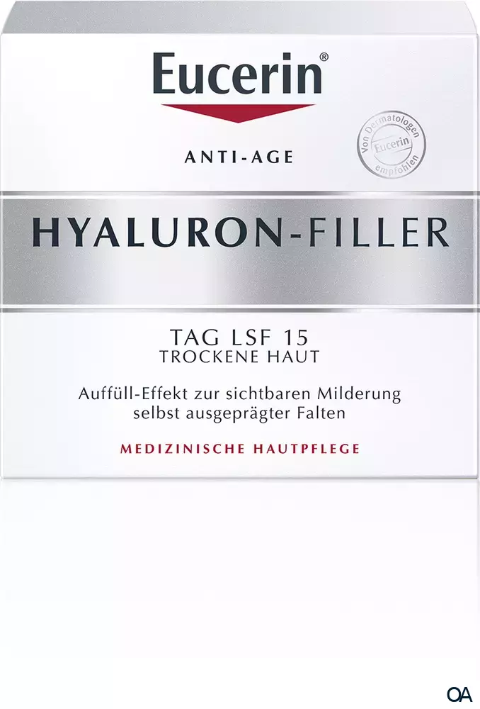 Die Eucerin HYALURON-FILLER Tagespflege für trockene Haut ist eine Anti-Age Tagescreme mit Hyaluron, die speziell für trockene Haut entwickelt wurde. Sie enthält eine einzigartige Kombination aus langkettigen und 40 mal kleineren, kurzkettigen Hyaluronsäure-Molekülen, um selbst ausgeprägte Falten von innen heraus aufzufüllen. Zusätzlich regt bioaktives Saponin die natürliche, hauteigene Hyaluronsäureproduktion an, um die Hautfeuchte zu verbessern und Falten zu mildern. LSF 15 mit UVA-Schutz beugt vorzeitiger Hautalterung und der Verstärkung von Falten vor. Die Pflege eignet sich ausgezeichnet als Make-up-Grundlage.