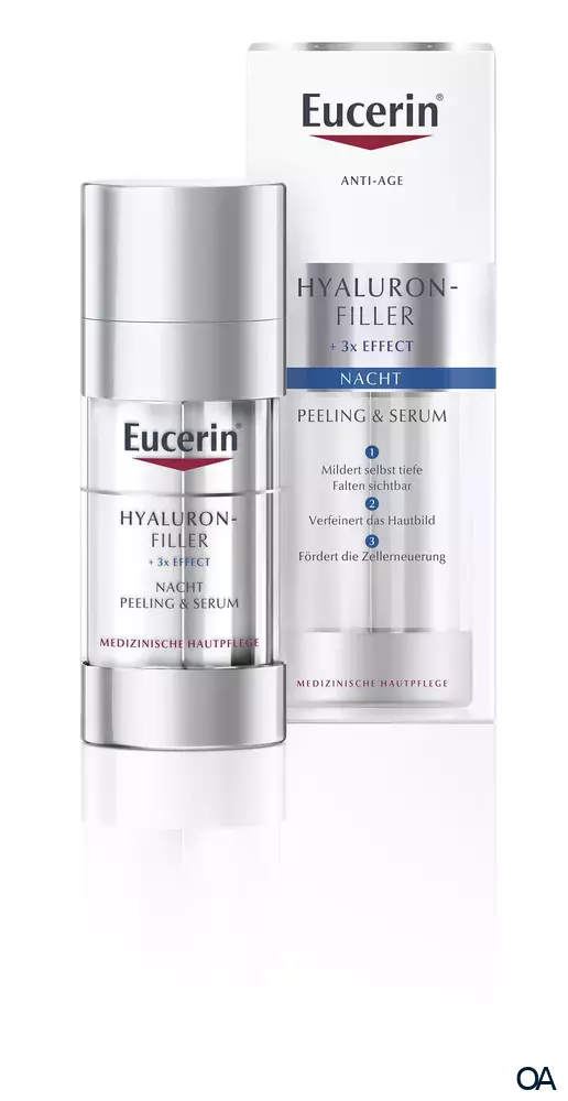 Die beiden hochwirksamen Formeln vereinen sich in einem Produkt für ein verjüngtes Aussehen Ihrer Haut. Das innovative Produkt wurde entwickelt für eine Anwendung am Abend. Durch klinische und dermatologische Studien wurde bewiesen, dass das Eucerin HYALURON-FILLER Nacht-Peeling & Serum bei regelmäßiger Anwendung das Hautbild verfeinert, die Zellerneuerung fördert und selbst tiefe Falten sichtbar mildert. Poren werden verfeinert und die Haut erhält neue Ausstrahlung und ist glatter.