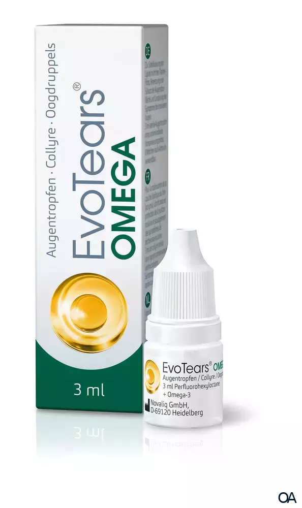 - Perfluorhexyloctan bedingt weitere, bislang in der Therapie des trockenen Auges unbekannte vorteilhafte Eigenschaften. EvoTears® OMEGA verteilt sich sehr schnell und bildet rasch einen Schutzmantel über der Träne. Dadurch wird einer vorzeitigen Verdunstung entgegengewirkt. Zudem ist ein Tropfen nur ca. 10 µl groß und deshalb kann einer Flasche EvoTears® OMEGA bis zu 280 Tropfen pro 3 ml Inhalt entnommen werden.