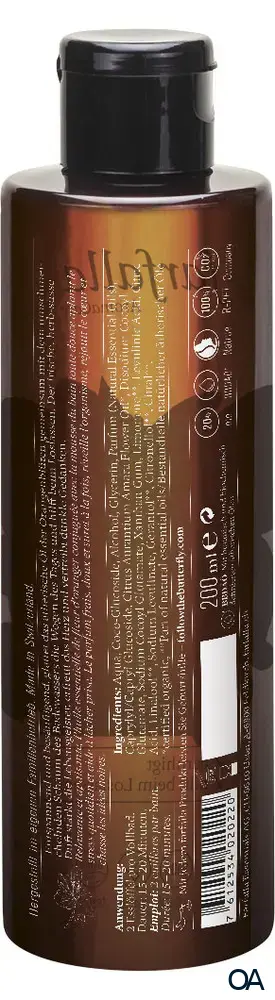Zusammensetzung: AQUA, COCO-GLUCOSIDE, ALCOHOL, GLYCERIN, PARFUM, CAPRYLYL/CAPRYL GLUCOSIDE, DISODIUM COCOYL GLUTAMATE, CITRIC ACID, XANTHAN GUM, LEVULINIC ACID, SODIUM COCOYL GLUTAMATE, SODIUM LEVULINATE, CITRUS AURANTIUM FLOWER OIL*, LIMONENE**, CITRUS AURANTIUM DULCIS PEEL OIL*, LINALOOL**, CITRUS AURANTIUM BERGAMIA PEEL OIL*, LINALYL ACETATE**, CITRUS AURANTIUM AMARA FLOWER OIL*, LAVANDULA ANGUSTIFOLIA OIL*, PELARGONIUM GRAVEOLENS FLOWER OIL*, CANANGA ODORATA FLOWER OIL*, PINENE**, GERANIOL**, CITRONELLOL**, BETA-CARYOPHYLLENE**, GERANYL ACETATE**, TERPINEOL**.* certified organic, * part of natural essential oils.