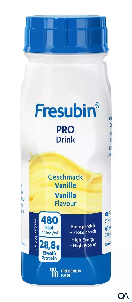 - Hinweise: Nicht geeignet, wenn eine enterale Ernährung kontraindiziert ist sowie bei Intoleranz gegen einen in Fresubin PRO Drink enthaltenen Inhaltsstoff. Nicht geeignet bei Galaktosämie. Nicht geeignet für Kinder < 7 Jahren. Bei Kindern < 10 Jahren mit Vorsicht verwenden.