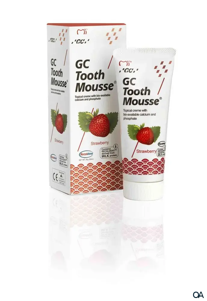 - Gegenanzeigen: Recaldent (CPP-ACP) ist ein Milch-Kasein-Derivat. GC Tooth Mousse nicht bei Milcheiweißallergie oder einer Allergie/Sensibilisierung auf benzoathaltige Konservierungsmittel anwenden.