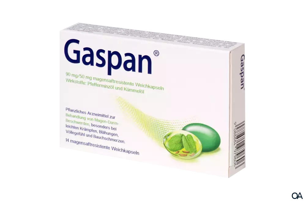 Gaspan 90 mg/50 mg magensaftresistente Weichkapseln sind ein pflanzliches Arzneimittel zur Behandlung von Magen-Darm-Beschwerden, besonders bei leichten Krämpfen, Blähungen, Völlegefühl und abdominalen Schmerzen.