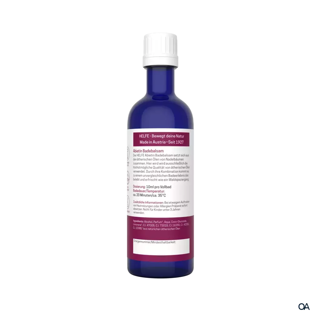 Der HELFE Abietin Badebalsam setzt sich aus den ätherischen Ölen von Nadelbäumen zusammen. In der Premium-Linie Selection wird ausschließlich die höchstmögliche Qualität von ätherischen Ölen verwendet. Durch ihre Kombination kommt es zu einem unvergleichlichen Badeerlebnis, das belebt und erfrischt wie ein Waldspaziergang.