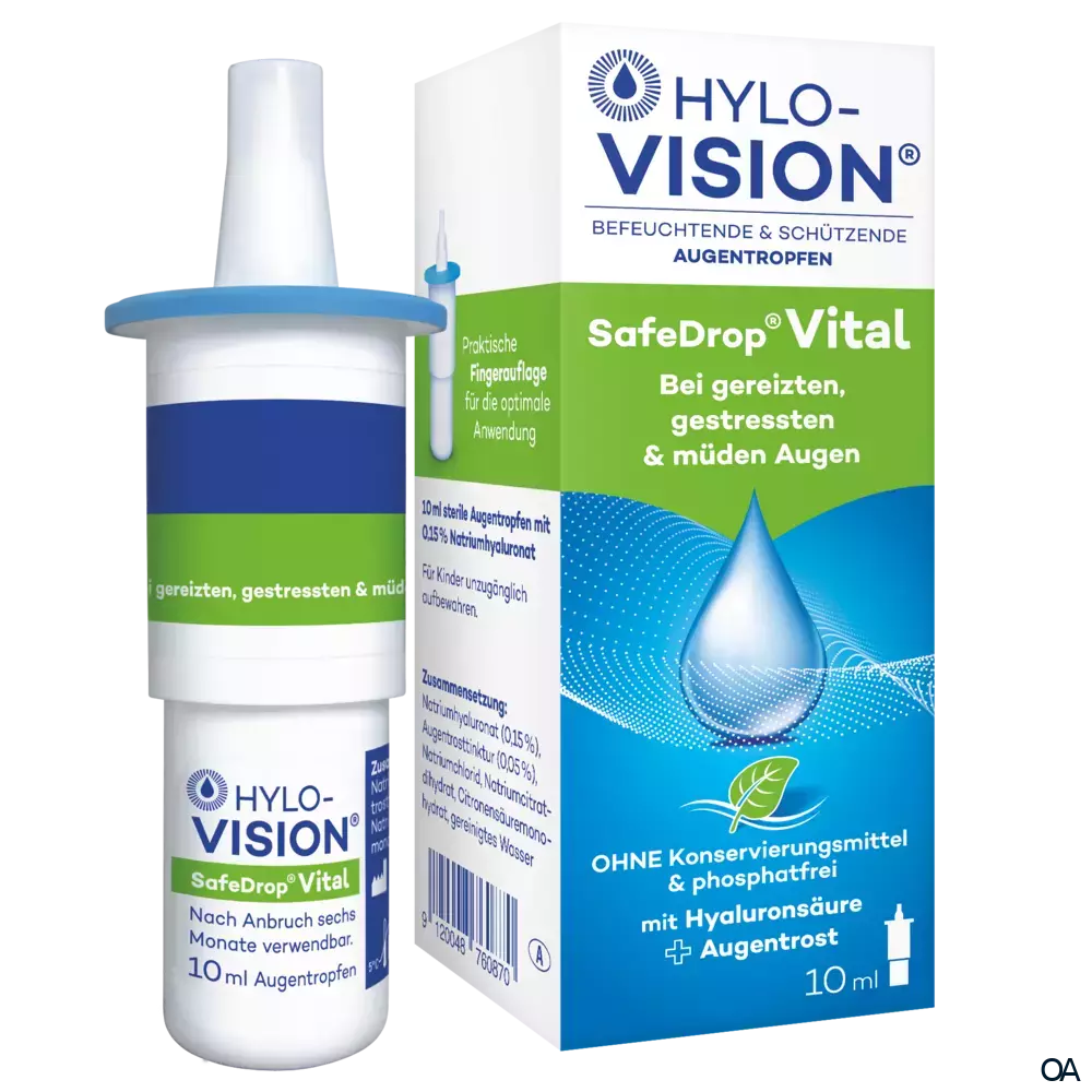 - Hylo-Vision® SafeDrop® Vital ist ein steriles, phosphatfreies Benetzungsmittel im innovativen Safe-Drop®-System, einem von OmniVision mitentwickelten, konservierungsmittelfreien Mehrdosenbehältnis. Mit Hilfe der praktischen breiten Fingerauflage kann es optimal angewendet werden.