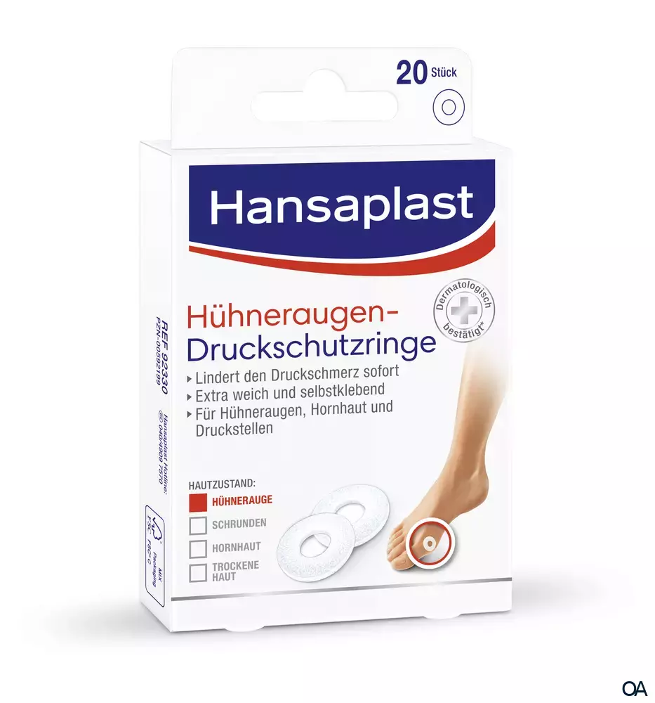 Die sanften Hansaplast Hühneraugen-Druckschutzringe schützen Hühneraugen vor schmerzhaftem Druck durch Schuhe. Optimaler Schutz vor schmerzhaftem Druck – für Hühneraugen, Hornhaut und empfindliche Stellen.