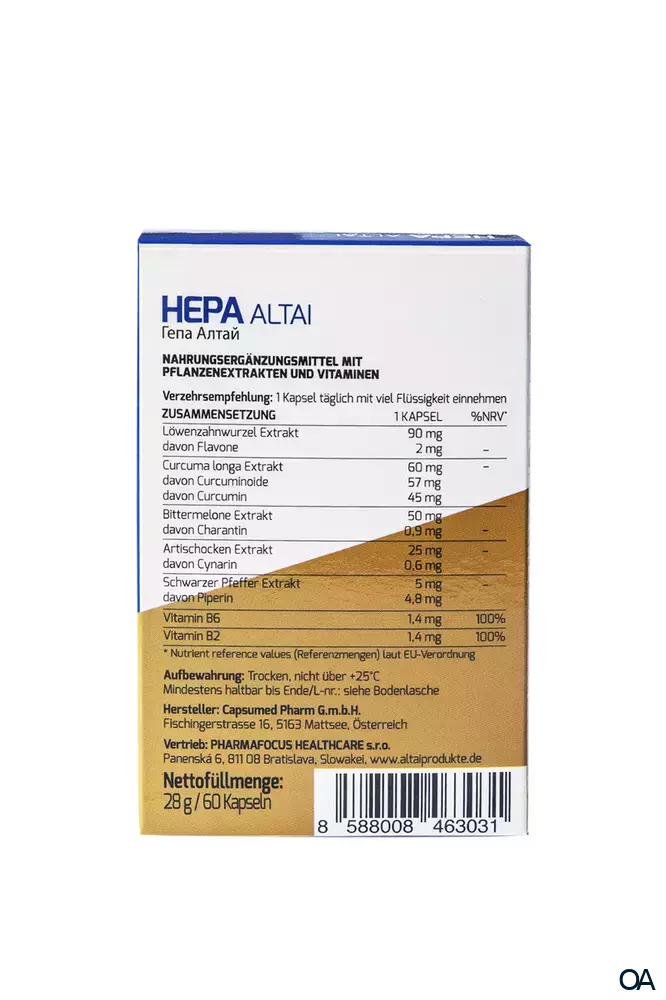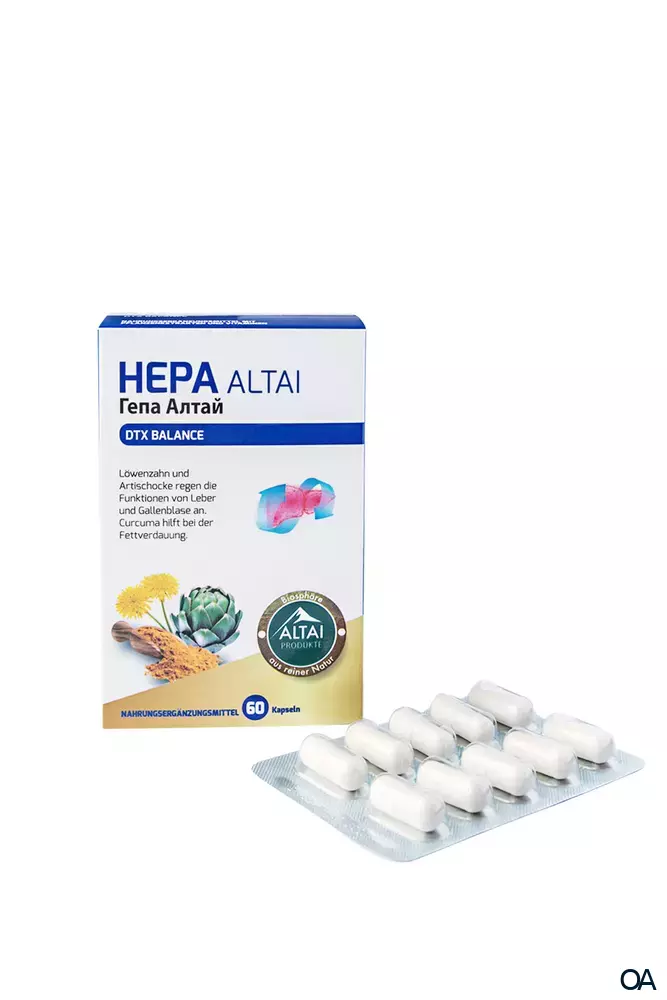 Hepa Kapseln Altai ist ein Nahrungsergänzungsmittel mit Löwenzahn und Artischocke. Diese regen die Funktionen von Leber und Gallenblase an. Curcuma hilft bei der Fettverdauung.