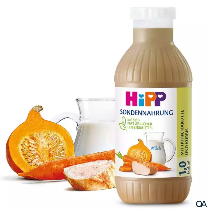 HiPP Sondennahrung mit Huhn, Karotte und Kürbis ist ein Lebensmittel für besondere medizinische Zwecke (bilanzierte Diät). Vollbilanzierte Standardnahrung auf Basis natürlicher Lebensmittel, für Erwachsene und Kinder ab 1 Jahr.HiPP Sondennahrung mit Huhn, Karotte und Kürbis ist ein Lebensmittel für besondere medizinische Zwecke (bilanzierte Diät). Vollbilanzierte Standardnahrung auf Basis natürlicher Lebensmittel, für Erwachsene und Kinder ab 1 Jahr.