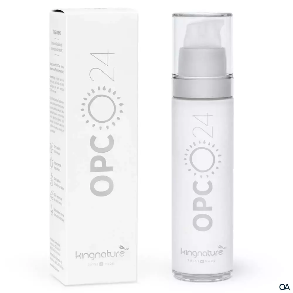 Die Kingnature OPC 24 Tagescreme enthält OPC. OPC ist ein sekundärer Pflanzenstoff, der das Kollagen in der äußeren Hautschicht aufbaut. Das führt zu einer strafferen Haut, deutlich geringerer Faltentiefe und einem verlangsamten Alterungsprozess der Haut.