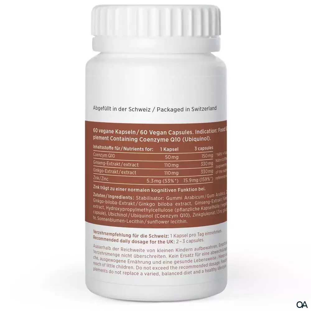 - 1 Kapsel enthält 50 mg Coenzym Q10, 100 mg Ginkgo-Extrakt, 100 mg Ginseng-Extrakt.