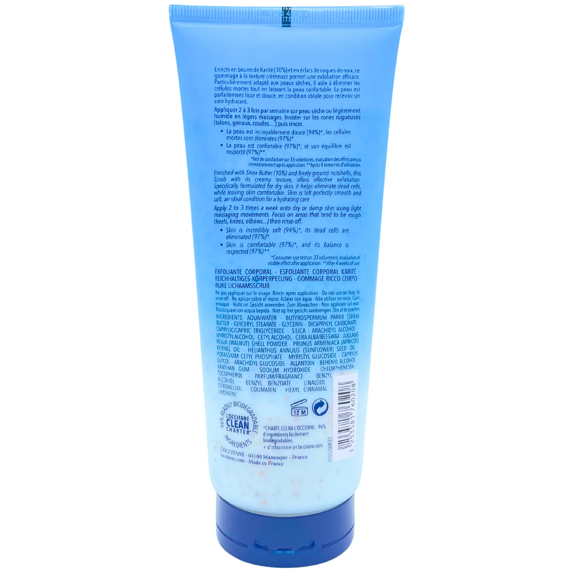 Aqua/Water, Butyrospermum Parkii (Shea) Butter, Glyceryl Stearate, Glycerin, Dicaprylyl Carbonate, Caprylic/Capric Triglyceride, Silica, Arachidyl Alcohol, Myristyl Alcohol, Cetyl Alcohol, Cera Alba/Beeswax, Juglans Regia (Walnut) Shell Powder, Prunus Armeniaca (Apricot) Kernel Oil, Helianthus Annuus (Sunflower) Seed Oil, Potassium Cetyl Phosphate, Myristyl Glucoside, Caprylyl Glycol, Arachidyl Glucoside, Allantoin, Behenyl Alcohol, Xanthan Gum, Sodium Hydroxide, Chlorphenesin, Tocopherol, Parfum/Fragrance, Benzyl Alcohol, Benzyl Benzoate, Linalool, Citronellol, Coumarin, Hexyl Cinnamal, Limonene