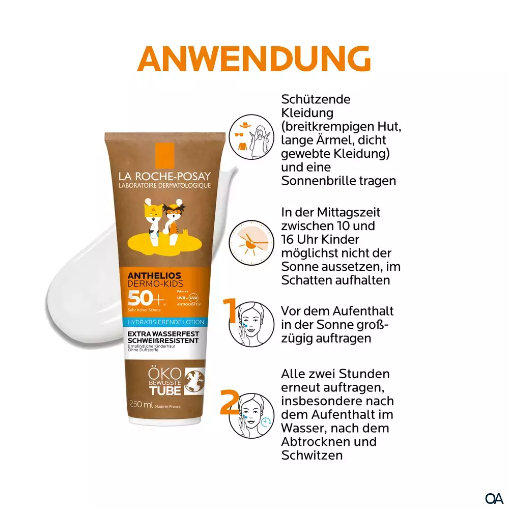 - Die La Roche Posay Anthelios Dermo-Kids Milch LSF 50+ unmittelbar vor dem Sonnenbaden großzügig auf Gesicht und Körper auftragen. Die Allergiker Sonnencreme regelmäßig erneut auftragen - insbesondere nach dem Baden, Schwitzen oder Abtrocknen. Dabei die Augenpartie aussparen. Babys und Kleinkinder sollten nicht der direkten Sonneneinstrahlung ausgesetzt werden. Die Mittagssonne meiden. Zusätzlich sollten Babys und Kleinkinder mit weiteren Sonnenschutzmaßnahmen geschützt werden, wie beispielsweise einer Kopfbedeckung, Sonnenbrille und spezieller UV-Kleidung.