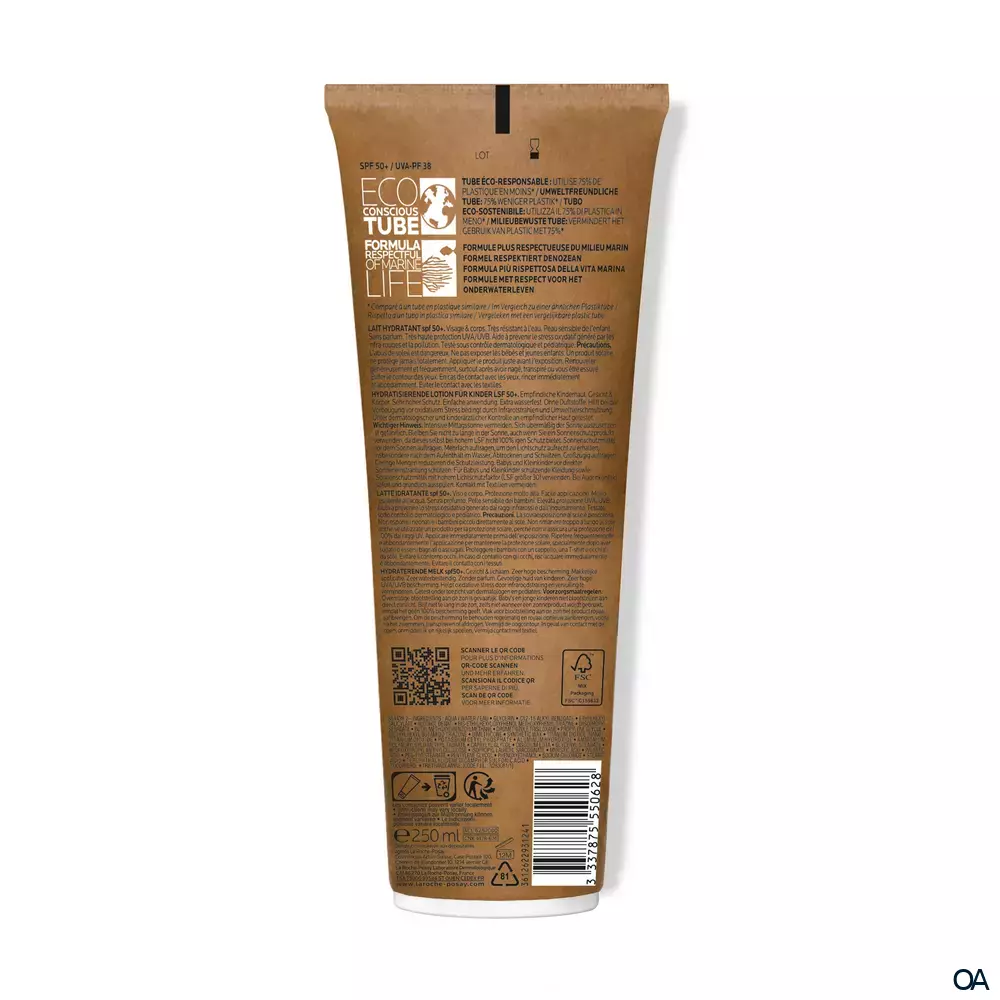 Anthelios Dermo-Kids Sonnenmilch LSF 50+ für die empfindliche Baby- und Kinderhaut Die extrem resistente Sonnencreme für Kinder bewahrt die Haut dank XL-Protect-Technologie vor gefährlicher UVA- und UVB-Strahlung sowie vor externen Umwelteinflüssen und Infrarotstrahlen. Für eine noch bessere Schutzwirkung ist die La Roche Posay Baby Sonnenmilch extrem wasser-, schweiß- und abriebfest. Ihre feuchtigkeitsspendende, safte Formel mit Thermalwasser aus La Roche-Posay zieht schnell ein, fettet und klebt nicht und trocknet transparent auf der Haut an. -53% Plastik im Vergleich zur Tube mit Pappe der 1. Generation.