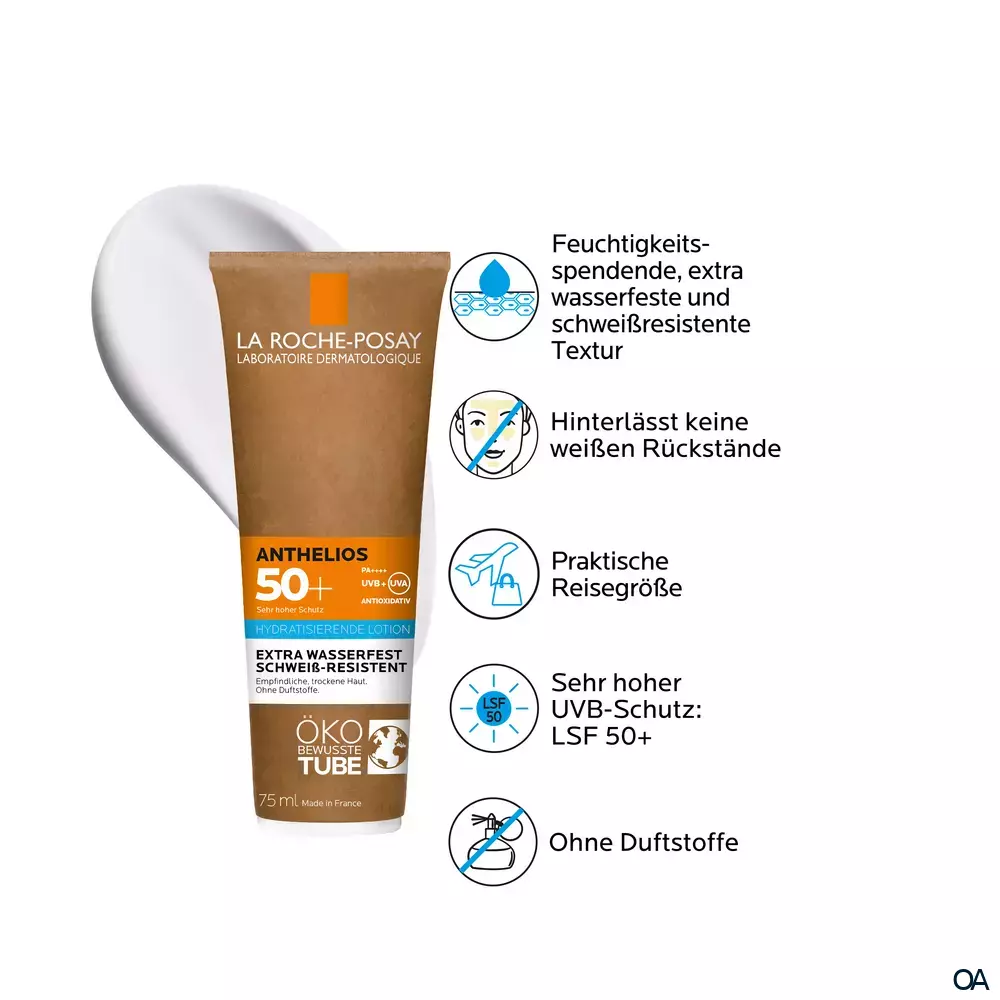 Die ANTHELIOS Hydratisierende Milch LSF 50+ für den Körper schützt zuverlässig vor schädlichen UVA- und UVB-Strahlen. Dank Glycerin und Thermalwasser aus La Roche-Posay spendet sie bis zu 24 Stunden Feuchtigkeit. Dank Netlock-Technologie bildet die samtige Formel der ANTHELIOS Hydratisierende Milch LSF 50+ von La Roche Posay einen wasserfesten, sand- und schweißresistenten Schutz. Zudem verläuft, fettet sowie klebt der Sonnenschutz für empfindliche Haut nicht und hinterlässt keine weißen Rückstände. Die innovative Papp-Tube enthält FSC- oder PEFC-zertifizierte Pappanteile und spart, im Vergleich zur bisherigen Plastiktube, 45 % Neuplastik ein.