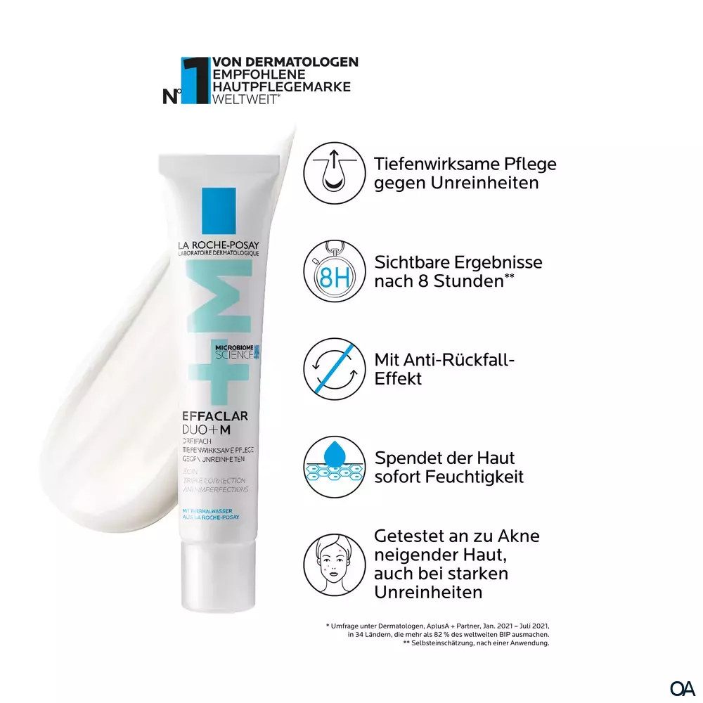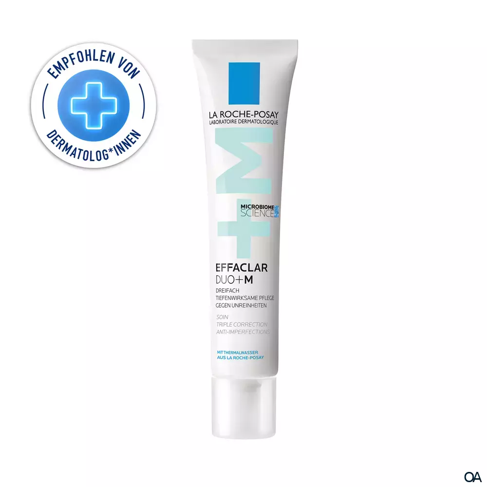 Die La Roche Posay EFFACLAR Duo+M wurde mit Hilfe der Mikrobiom-Wissenschaft entwickelt und wirkt effektiv gegen Pickel, Mitesser und andere Hautunreinheiten. Der neue Wirkstoff Phylobioma mildert die Überproduktion von Talg und glättet das Hautbild sowie korrigiert wissenschaftlich bestätigt Hautunreinheiten. Zusätzlich hilft Niacinamid dabei, das Erscheinungsbild dunkler Flecken und Pigmentierungen zu verblassen. Die Gesichtspflege für unreine, zu Akne neigende Haut mildert Pickel, Mitesser und Pickelmale bereits ab 8 Stunden sichtbar und spendet der Haut gleichzeitig intensive Feuchtigkeit. Dank der hochwirksamen Formulierung bietet EFFACLAR Duo+M einen Anti-Rückfall-Effekt.