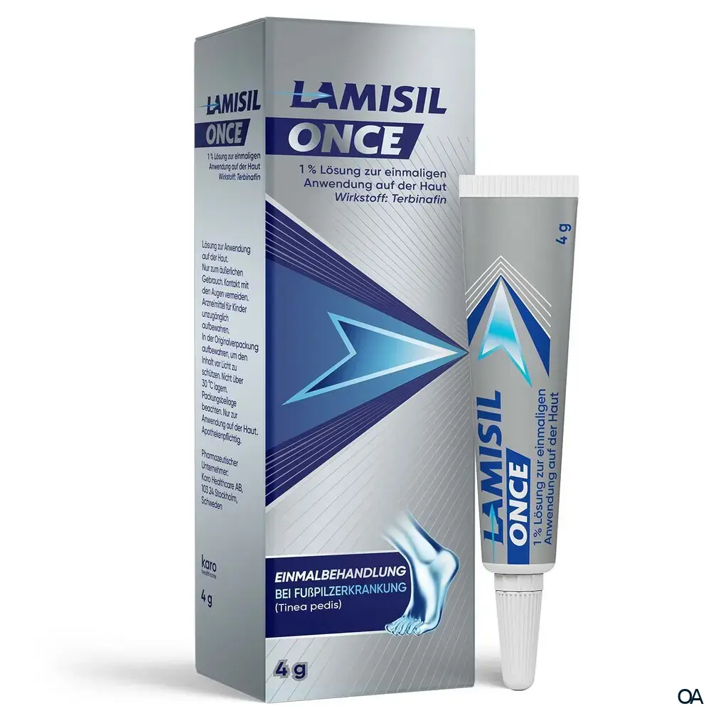 Die LamisilOnce 1 % Lösung zur einmaligen Anwendung auf der Haut ist ein rezeptfreies Arzneimittel mit dem Wirkstoff: Terbinafin und behandelt Tinea pedis (Fußpilzerkrankung) mit einer einzigen Anwendung.Die LamisilOnce 1 % Lösung zur einmaligen Anwendung auf der Haut ist ein rezeptfreies Arzneimittel mit dem Wirkstoff: Terbinafin und behandelt Tinea pedis (Fußpilzerkrankung) mit einer einzigen Anwendung.