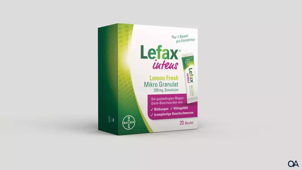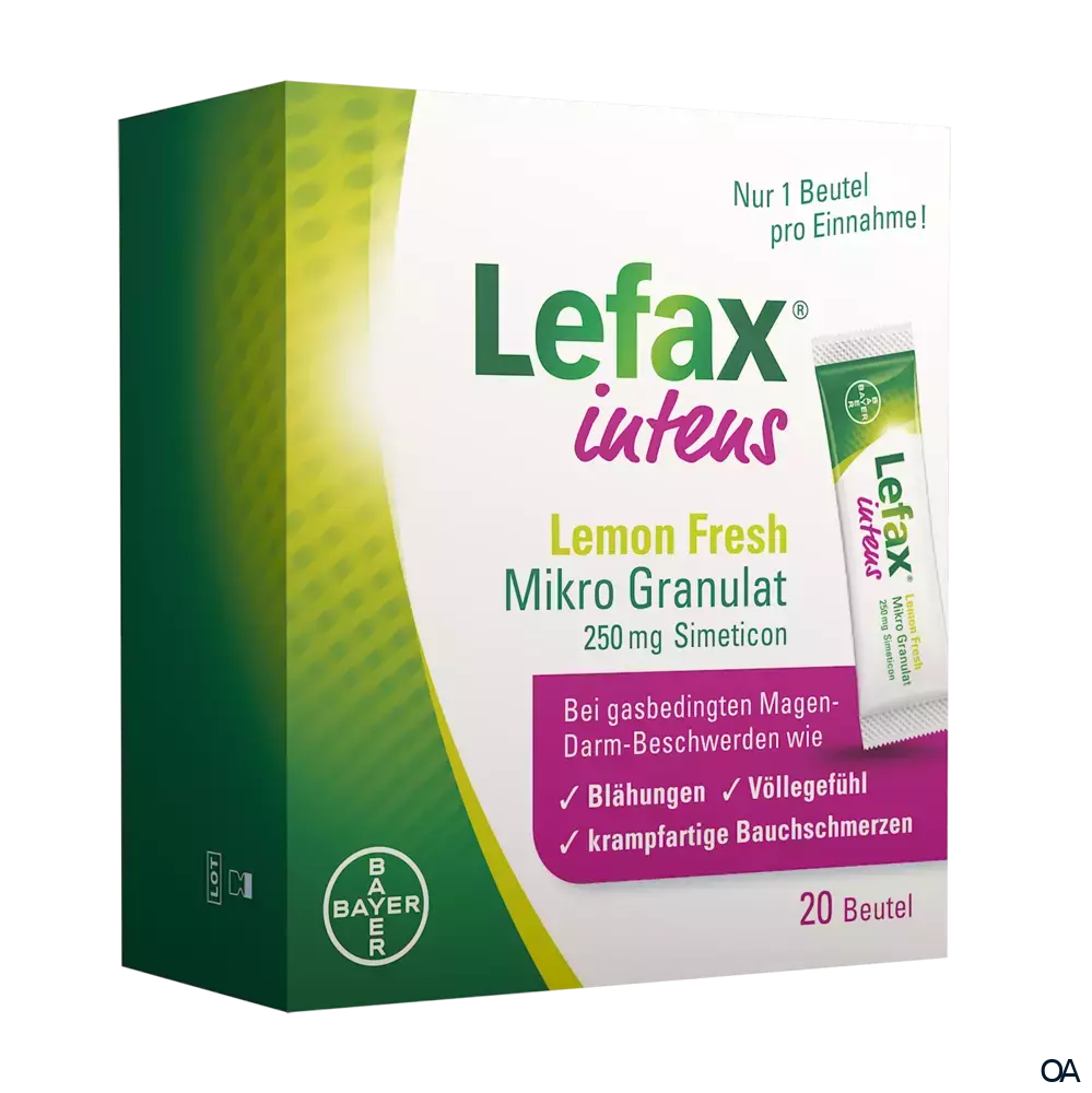 - Lefax® intens ist das höchst dosierte Lefax®-Produkt und hilft daher besonders bei stärkeren Beschwerden. Das Anwendungsgebiet umfasst die Linderung und Behandlung von gasbedingten Magen-Darm-Beschwerden wie Blähungen (Meteorismus), Völlegefühl, krampfartigen Bauchschmerzen oder Aufstoßen. Ebenfalls wird es zur Vorbereitung von diagnostischen Untersuchungen im Bauchbereich herangezogen, zum Beispiel vor einer Röntgenuntersuchung oder einer Endoskopie.