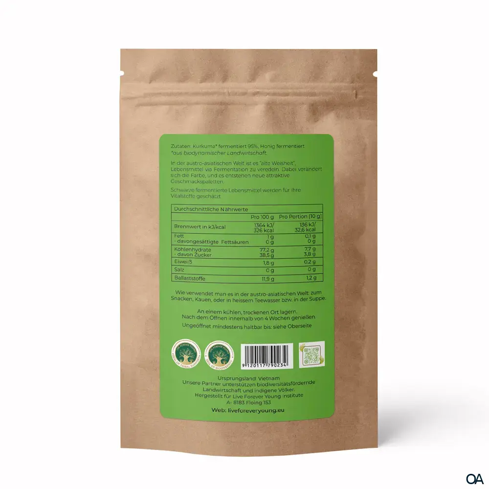 - Zutaten: 95% Kurkuma fermentiert, 5% Honig fermentiert.