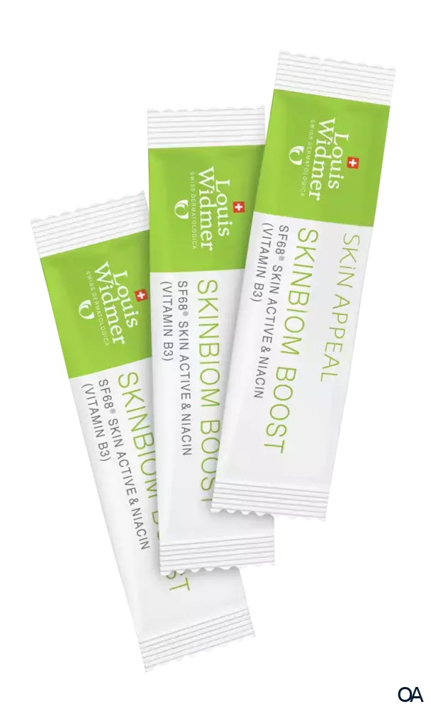 Die Louis Widmer Skin Appeal Skinbiom Boost Sachets sind ein Nahrungsergänzungsmittel zur Unterstützung für ein verbessertes Hautbild bei unreiner und fettiger Haut mit Niacin und Milchsäurebakterien.